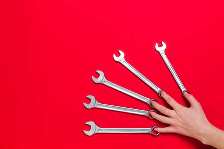 Set of wrenches different size and man hand lays on a red background. Banner with tools and the place for text with industrial holiday concept. Close-up.