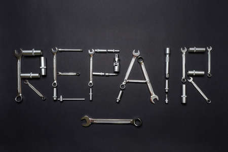Text REPAIR made of tool set on black background. Mechanic tools, wrenches or spanners. Technique repair, equipment for mechanical service, labor or father's day concept. Flat lay, top view.