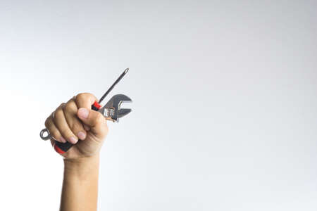 Hand holding screwdriver on white background