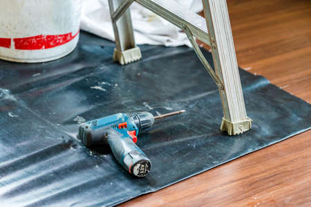 Electric screwdriver left on the floor, Maintenance and repairing concepts
