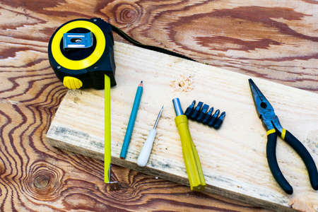 measuring tape pliers pencil screwdrivers and a board on the carpenter's workbench. High quality photo