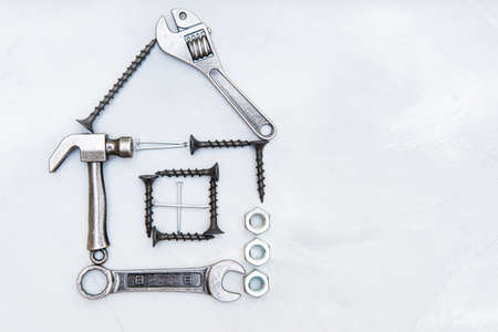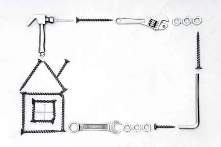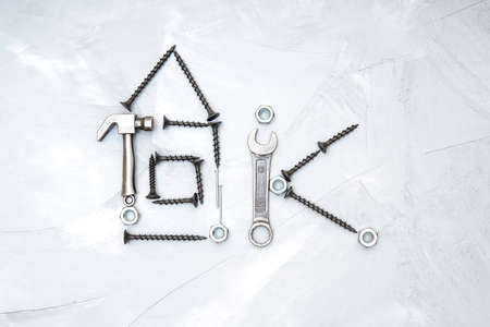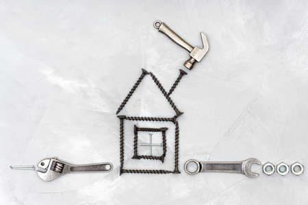 House shape made from screws with essential hand tools and fasteners arranged on a concrete background. Household maintenance and repair diagram.