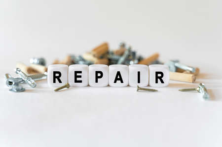 Construction business concept. On a white background, building fittings and white cubes with the inscription - repair