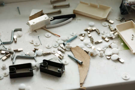 Furniture accessories with some tools on a dusty table