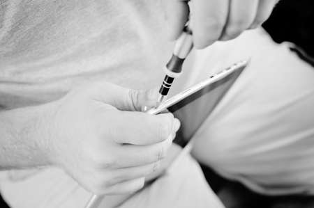 Black and white photography close up on hands of man repairing PC Tablet Device with screw driver