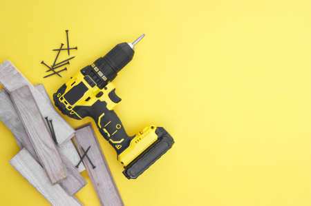 Close-up no name black yellow electric cordless screwdriver,not new,number of self-tapping screws of yellow metal laid out as template for bulleted list,white wooden table as background.Copy space