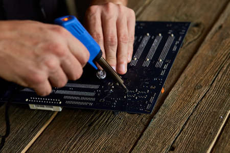 Engineer or technician repair electronic circuit board with soldering iron. Man hands soldiers computer circuit board using soldering iron. Copy space.
