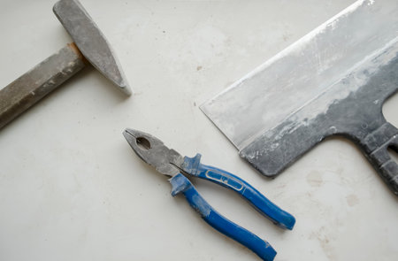Working tools for repair. Two spatulas and pliers on a dirty table.