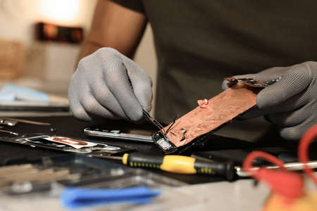 Technician repairing broken smartphone at table, closeup