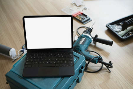 Mock up computer tablet and construction tools wooden floor.