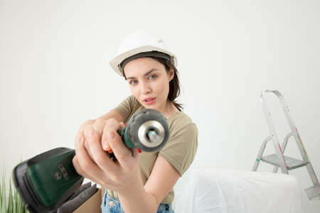 Portrait of confident young woman in hardhat using power screwdriver while doing renovation in new flat