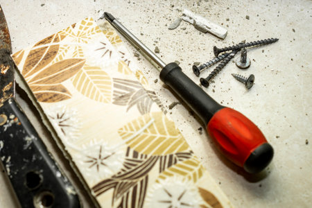 A small pile of self-tapping screws and a screwdriver, as well as several ceramic tiles and a metal repair spatula, lie on the table. Close-up