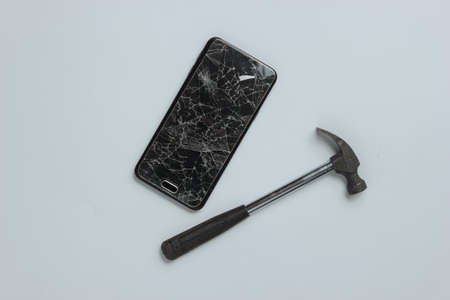 Smartphone with broken glass screen and hammer on a white background. Top view
