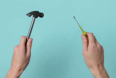 Repair concept. Female hand holds a screwdriver and a hammer on blue studio background.