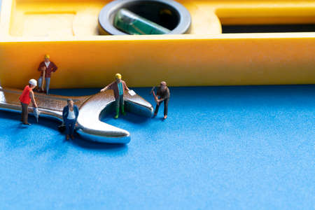 Miniature model engineers were consulted together and planning on the blue table background