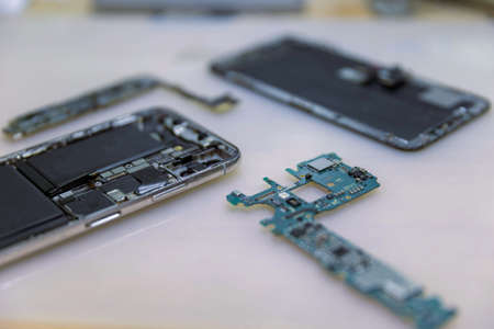 Phone repair concept several electronic devices taken apart into the components like the covers, circuit boards, bodies.