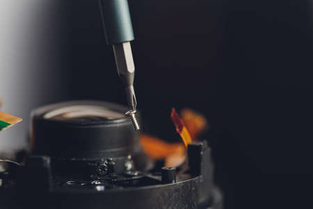 Precision prime optical dslr lens service, adjustment and alignment. Camera lens repair set in photo engineer workplace. Maintenance support of photographic photo camera lens