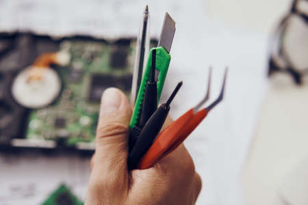 A man is repairing a Smartphone. Hands hold a screwdriver and disconnect the sim card loop. Services Repair. Selective focus.