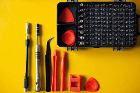 Yellow-black screwdriver on a yellow background, screws, a set of bits. Copy space.
