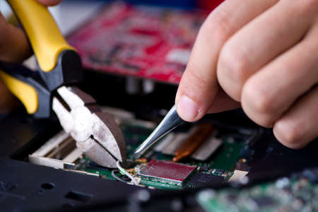Hardware diagnostics. Electronic parts. Engineer fixing laptop.