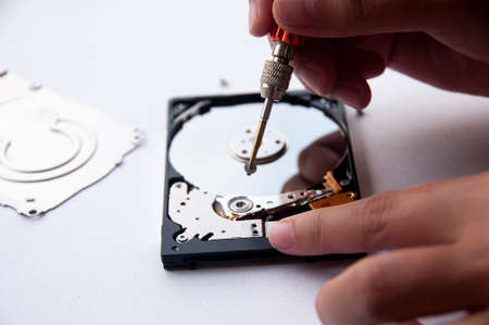 The abstract image of inside of hard disk drive with technician fixing using screw driver on white background. Concept of data, hardware, and information technology. Copy space