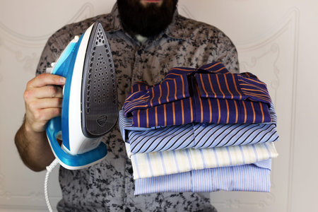 Professional Service. Man at home ironing clothes. house husband. Housekeeping. mature young man husband doing clothing ironing at home. hot and evaporation. modern life innovation