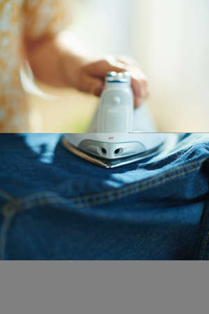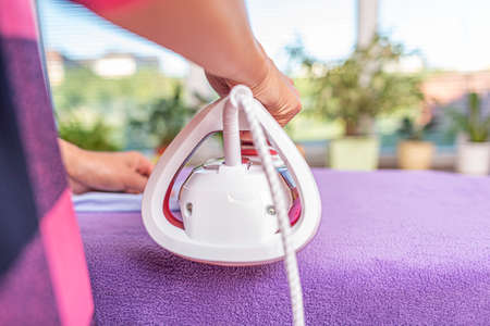Homework. Close-up, woman ironing clothes with an iron on an ironing board after washing.