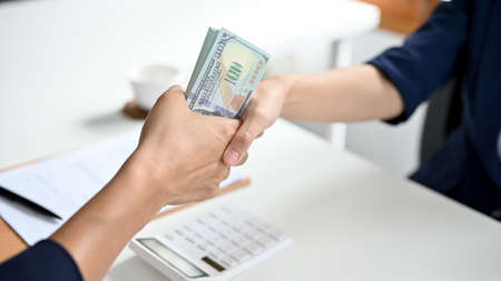Cropped image, A businessman giving a bribe money or banknote to his female assistant over the office desk. Corruption money.