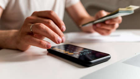 Close up view of mans hands with money indoors against woman that works by laptop.