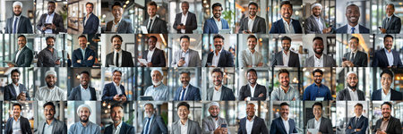 A mosaic collage showcases successful male and female businessmen of diverse ethnicities and ages, smiling confidently at the camera