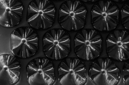 Close-up macro of sewing studs arranged in symmetrical rows in black and white abstraction