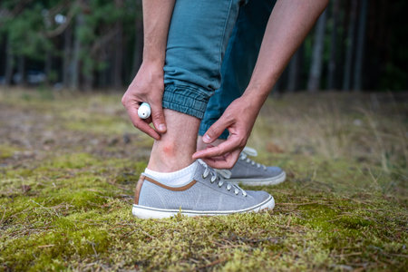 Man with mosquitoes bites itching leg, applying balm on swell skin, suffering from allergic reaction