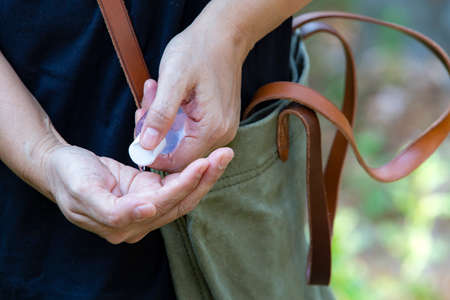 Woman's hands using portable wash hand sanitizer gel pump dispenser with alcohol gel sanitizer in bokeh green, Shoulder bag, Close up shot, Select focus, Prevention from covid19, Bacteria, Healthcare