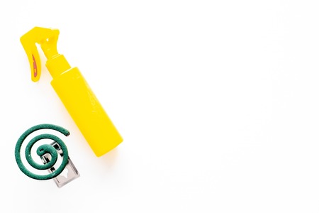 Mosquito protectors. Individual and for open space. Green spiral and spray on white background top view copy space
