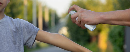 Mother spraying mosquito repellent on child hand outdoors in summer garden.