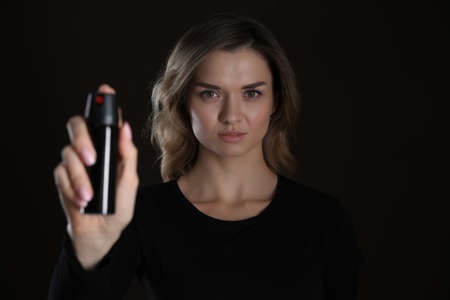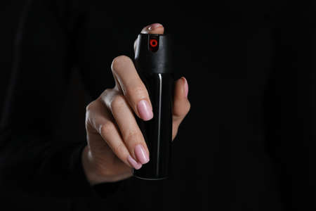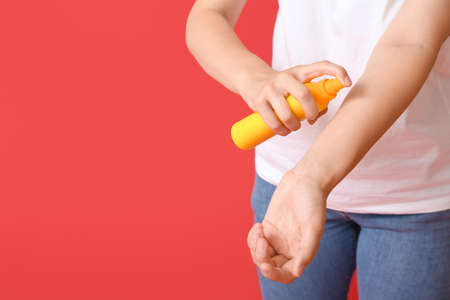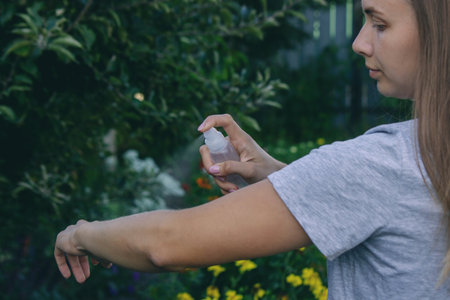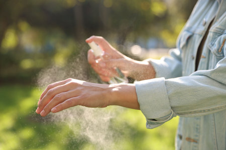 Woman applying insect repellent spray on her hand. Concept of preventing mosquito bites.