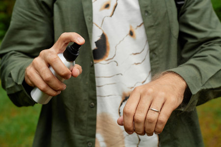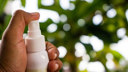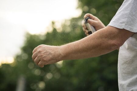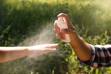 man spraying insect and mosquito repellent to his hand in the outdoor at vertical composition