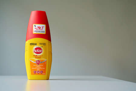 Magdeburg, Germany - June 23, 2021: Autan insect repellent from the family company SC Johnson & Son for repelling ticks, mosquitoes and other insects with copyspace on right side