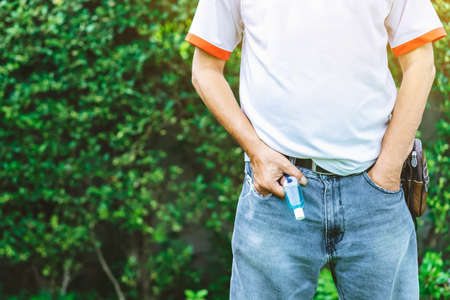 Health Care, Sanitary , Corona Virus (COVID-19) and Germ Protection Concept. Close up of man hand holding and using a mini bottle of alcohol 70% spray to copy space.