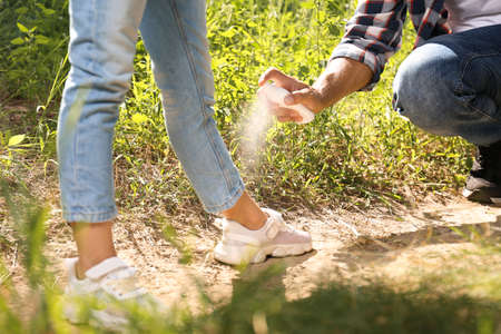 Young man spraying mosquito insect repellent in the forrest, insect protection.