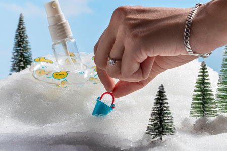 The delicate touch of a woman's hand arranging a winter-themed still life for a cosmetic product. The focus is on the action of placing a tiny bucket among the white, fluffy fake snow, emphasizing precision and art direction in seasonal marketing.