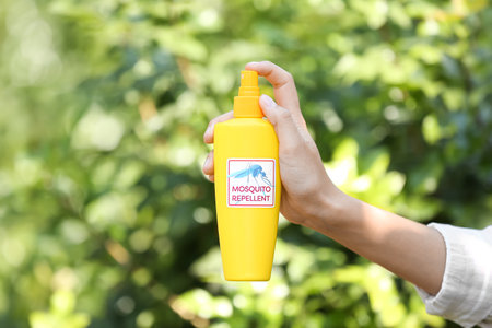 Woman applying insect repellent spray to prevent mosquito bites outside. Protection against malaria, zika virus, and dengue fever.