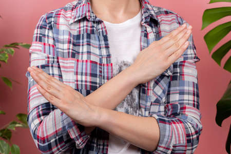 Crossed hands. Break the bias symbol of womans international day. Woman arms crossed to show solidarity, commitment to calling out bias, breaking stereotypes, inequality, rejecting discrimination
