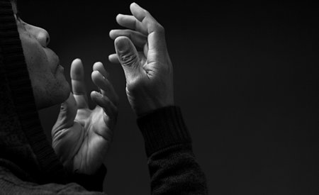 A man on a black background. Hands are folded in the position of prayer. Inner silence.