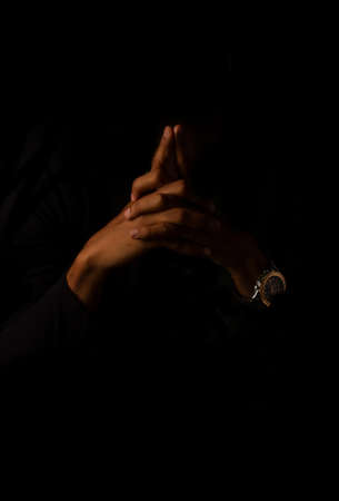 Generative AI : Man hands praying in dark background