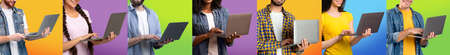 Unrecognizable multiethnic people typing on laptop keyboard, set of photos
