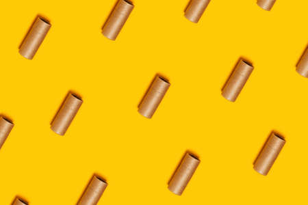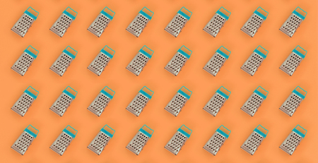 Geometric composition with repeating scientific calculators. Yellow pastel background. Science, business, calculations.