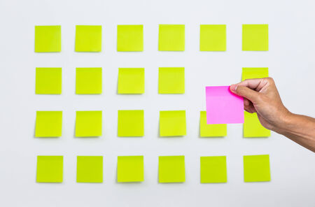 Blue or green and orange post it stick on white paper for people fill text, wording, your idea on them. Business and Brand storm thinking white share knowledge concept.
