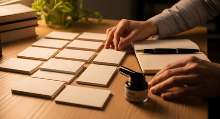 A person's hands are arranging rows of blank white cards on a wooden desk, next to an open notebook and a fountain pen with an ink pot. The scene depicts a brainstorming session, organization, or a creative planning process in a warm, studious environment.