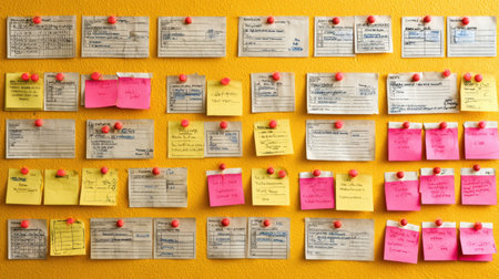 A vibrant arrangement of index cards and sticky notes on a yellow wall, showcasing organized thoughts, reminders, and project ideas in a creative workspace environment.